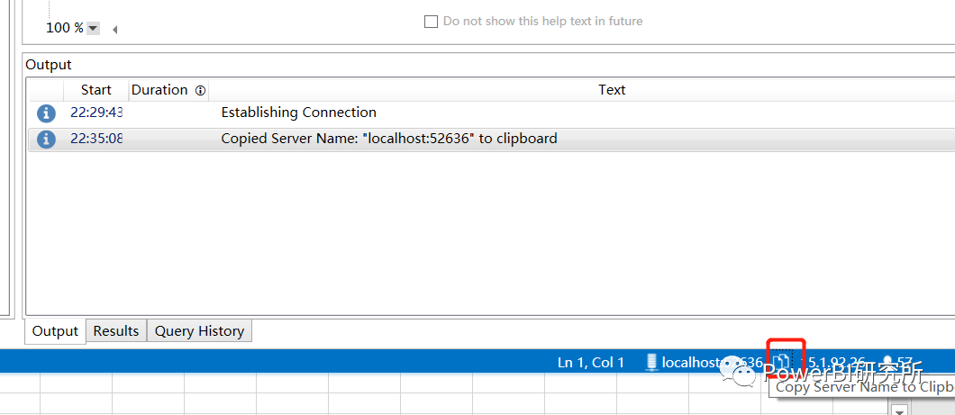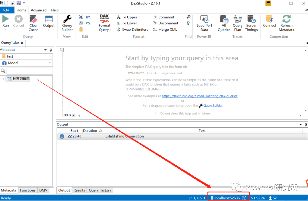 第二步:在打开的DAX Studio页面,查看右下角的localhost对应的数字,该数字就是端口号,如图: