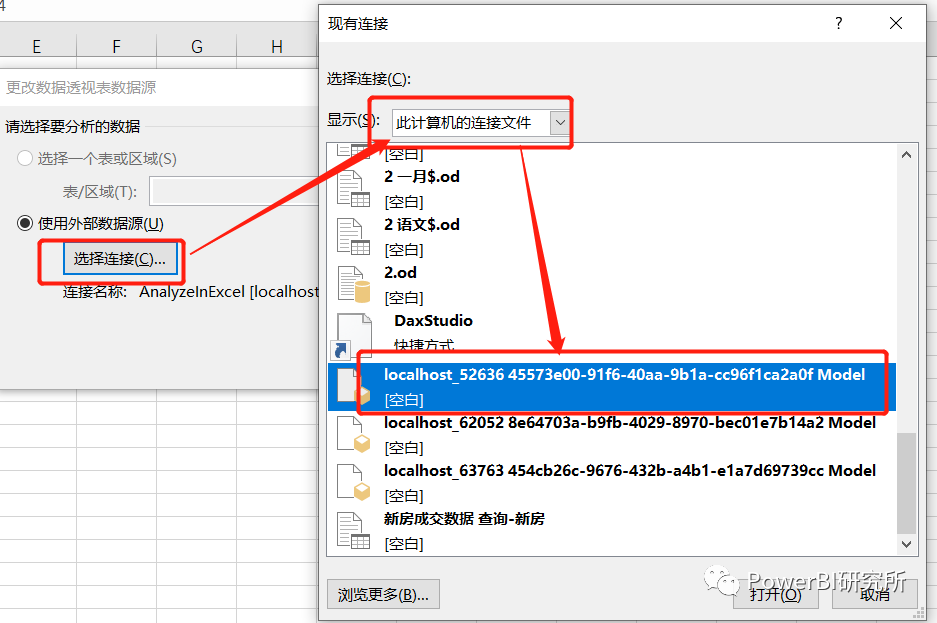 第十步:点击外部连接,选择此计算机的连接文件,下拉下拉框,找到刚刚复制的端口号对应的数据库文件,点击打开,如图: