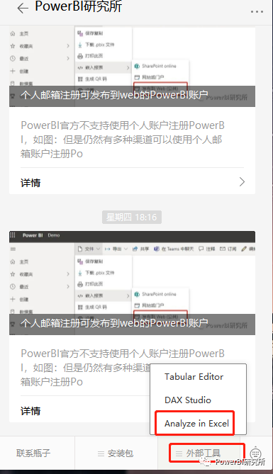 在公众号菜单栏,点击外部工具->Analyze in Excel,获取下载链接如图: