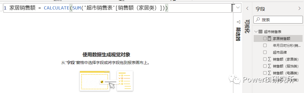 家居销售额 = CALCULATE(SUM('超市销售表'[销售额(家居类)]))