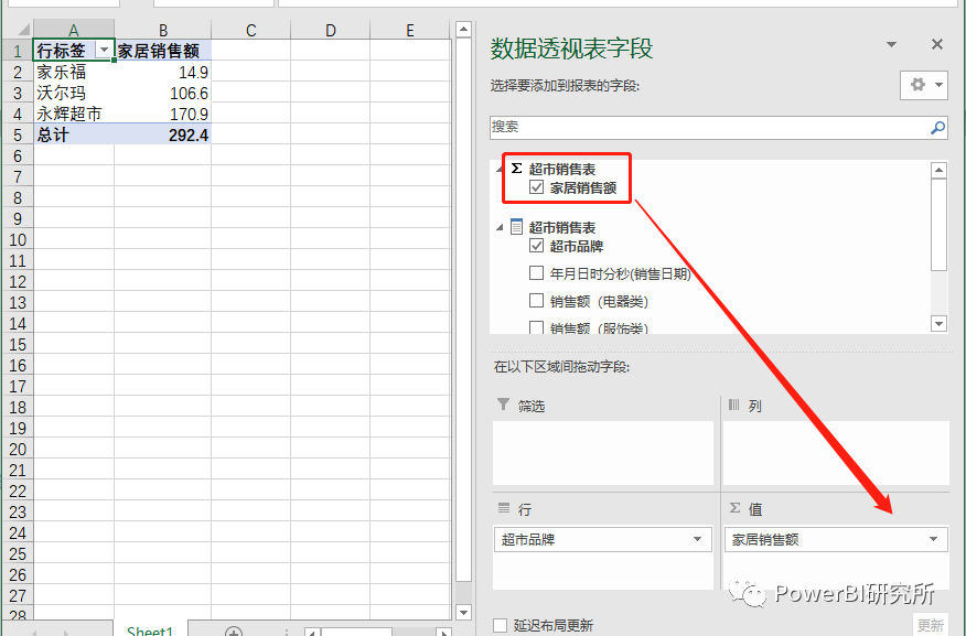 其中家居销售额为新建的度量值,用于EXCEL透视表的值区域(文末会有说明)