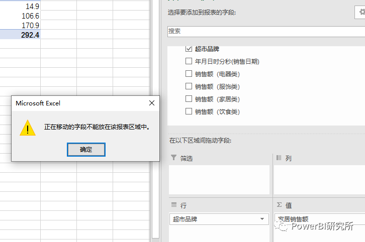 即 数字字段的销售额(家居类)不能放在值区域,如果拖动会有如下提示: