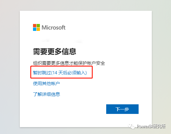 上述方法其实有个限制,就是第一个提必须是"需要更多信息",因为这个页面中有个暂时跳过(14天后必须输入)的蓝色小字,如图: