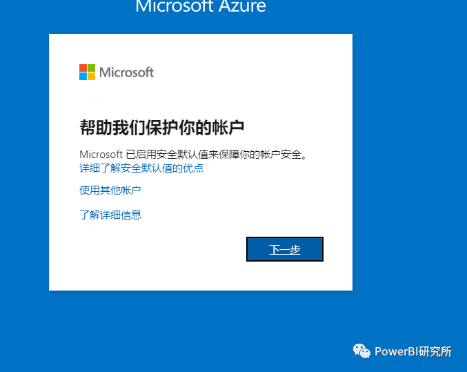 最近有小伙伴提到根据上述方法使用PowerBI账户登录Azure门户后,没有显示“需要更多信息”,而是显示如下提示“帮助我们保护你的账户”,并且没有14天后跳过的蓝色小字,如图: