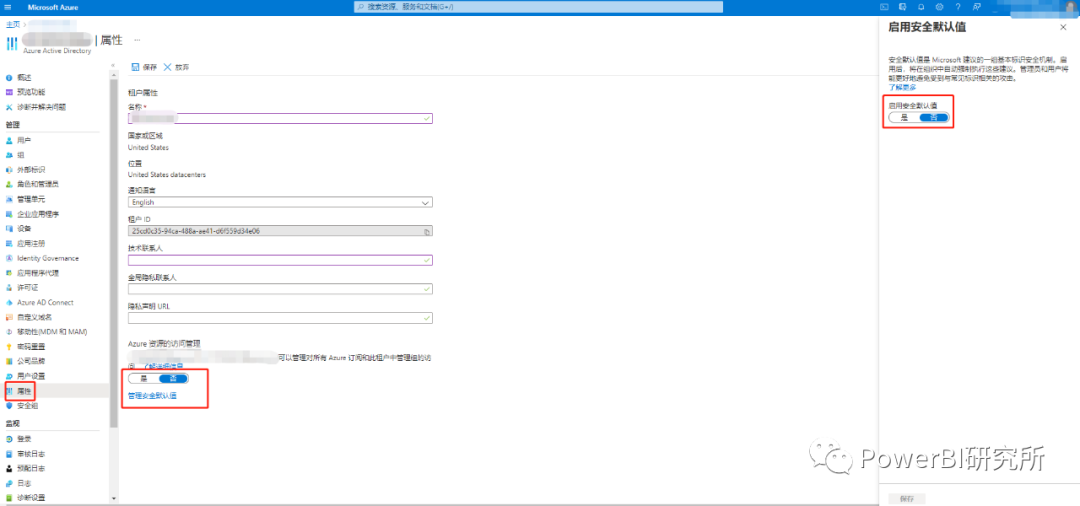 这样就可以不使用PowerBI账户登录Azure门户也可以关闭安全默认值了。