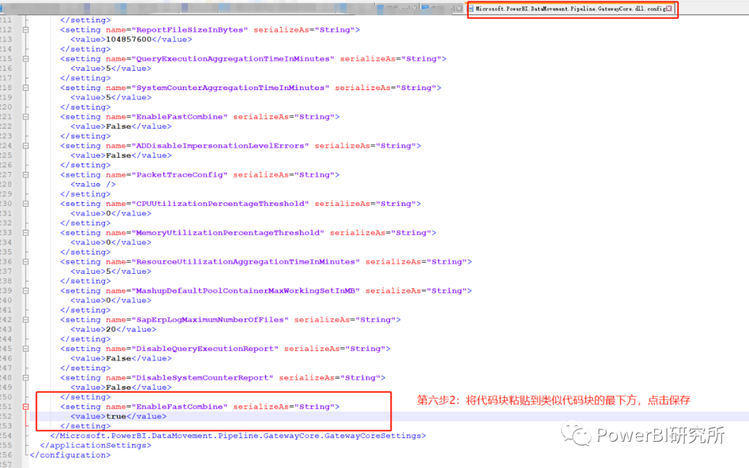 第六步:第五步出现的提示其实这是个假象,还需要进行一步配置,使用everything,找到Microsoft.PowerBI.DataMovement.Pipeline.GatewayCore.dll.config 这个文件,如图第六步1,将 <setting name="EnableFastCombine" serializeAs="String"> <value>true</value> </setting>