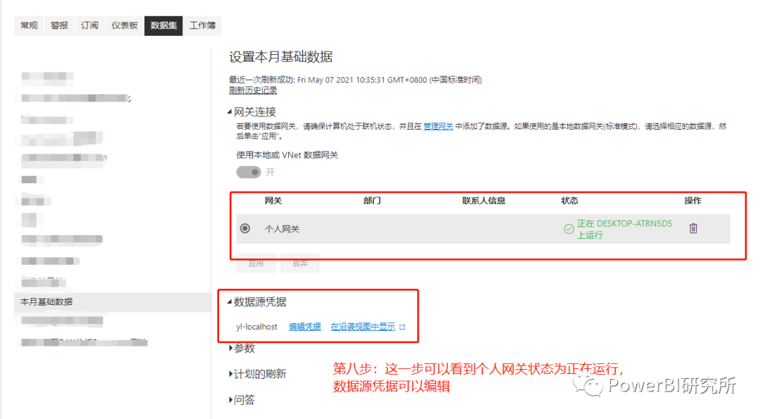 第七步:第六步文件配置之后,回到第五步出现的界面,选择 服务设置,重启网关 第八步:登录power bi服务之后,在数据集设置页面可以看到网关正在运行,凭据可以编辑,如图