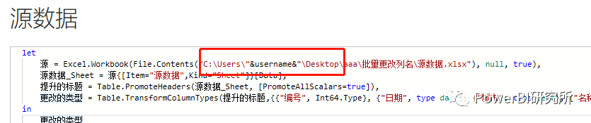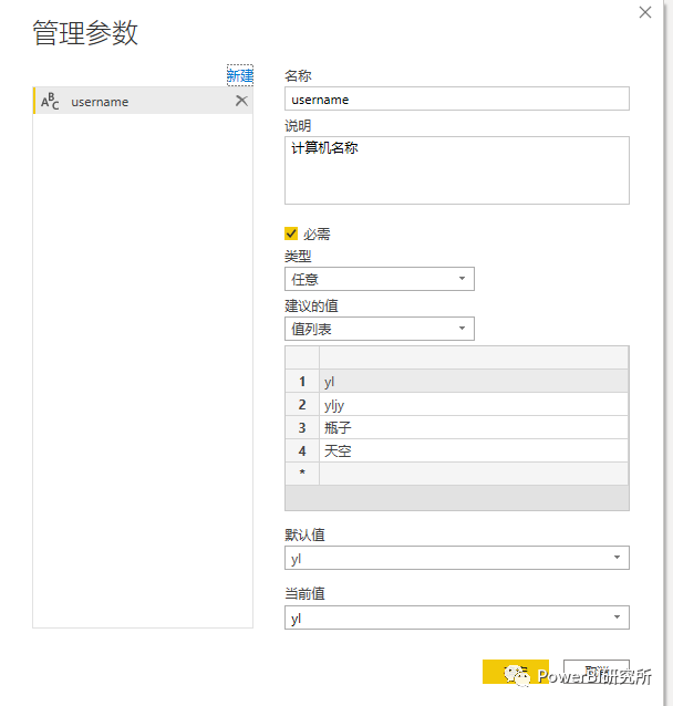 法一:场景,当我们把pbi文件发给其他人的时候,如果除计算机账户名称外,其他路径相同的情况。可以将计算机名称做成参数列表username,在power query编辑中将该参数添加到路径中,最后保存模板文件为pbit格式(pbit文件打开后会自动弹出弹框,选择username参数值后才能正式打开pbi文件),如图: