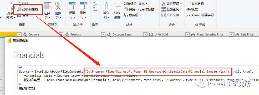 第三步:进入power query编辑器页面之后,点击高级编辑器,会在第一行看到示例数据集所在的路径,如图: