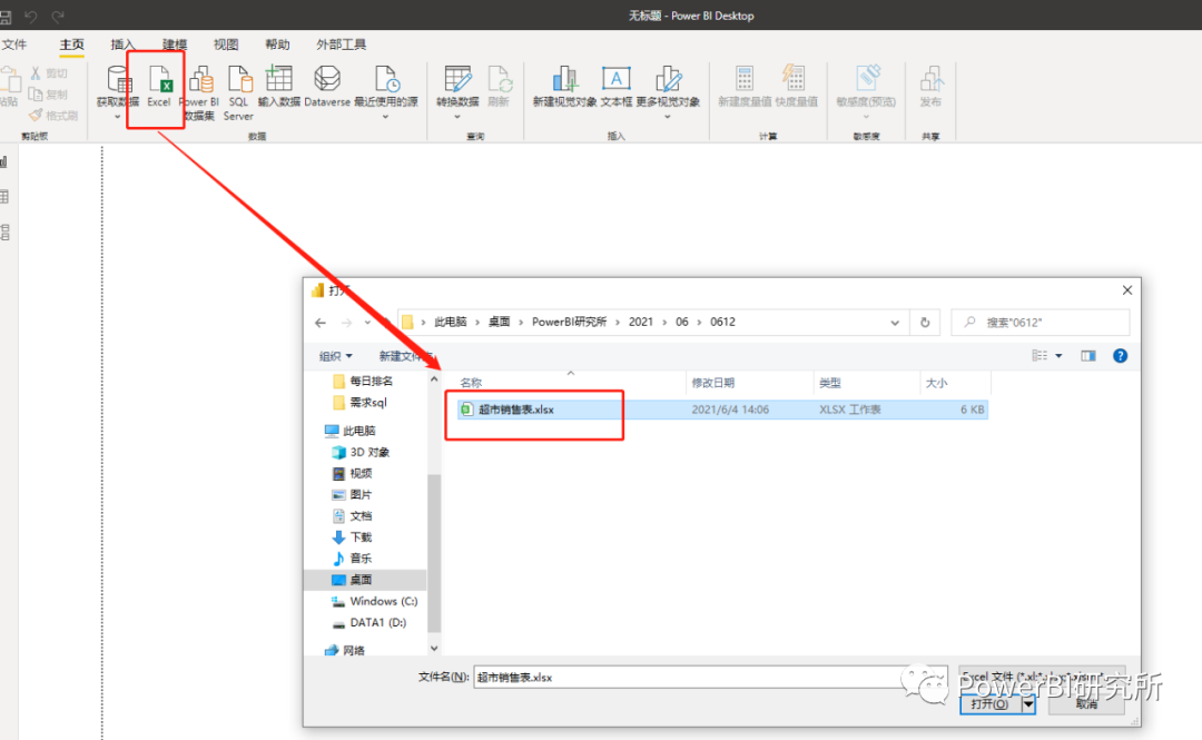 第一步:打开PowerBI,导入表格,点击EXCEL按钮,导入表格,如图: