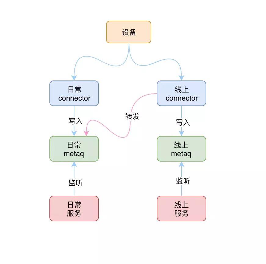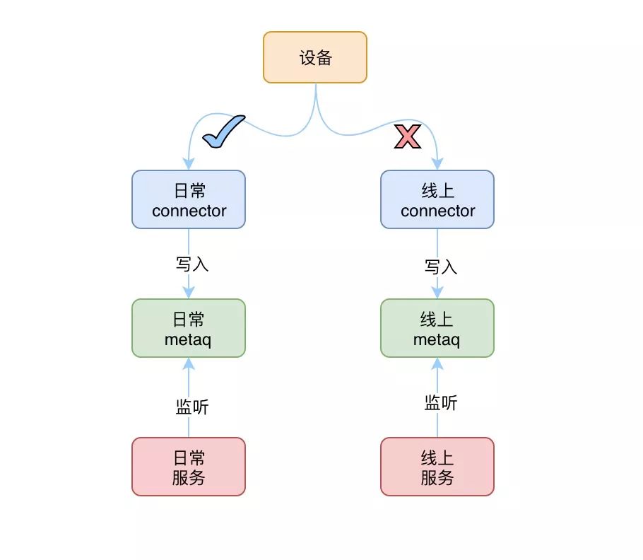 我们的设备是将数据直接上报到 metaq 中,系统对 metaq 进行监听,但是线上和日常环境的网络是隔离的。