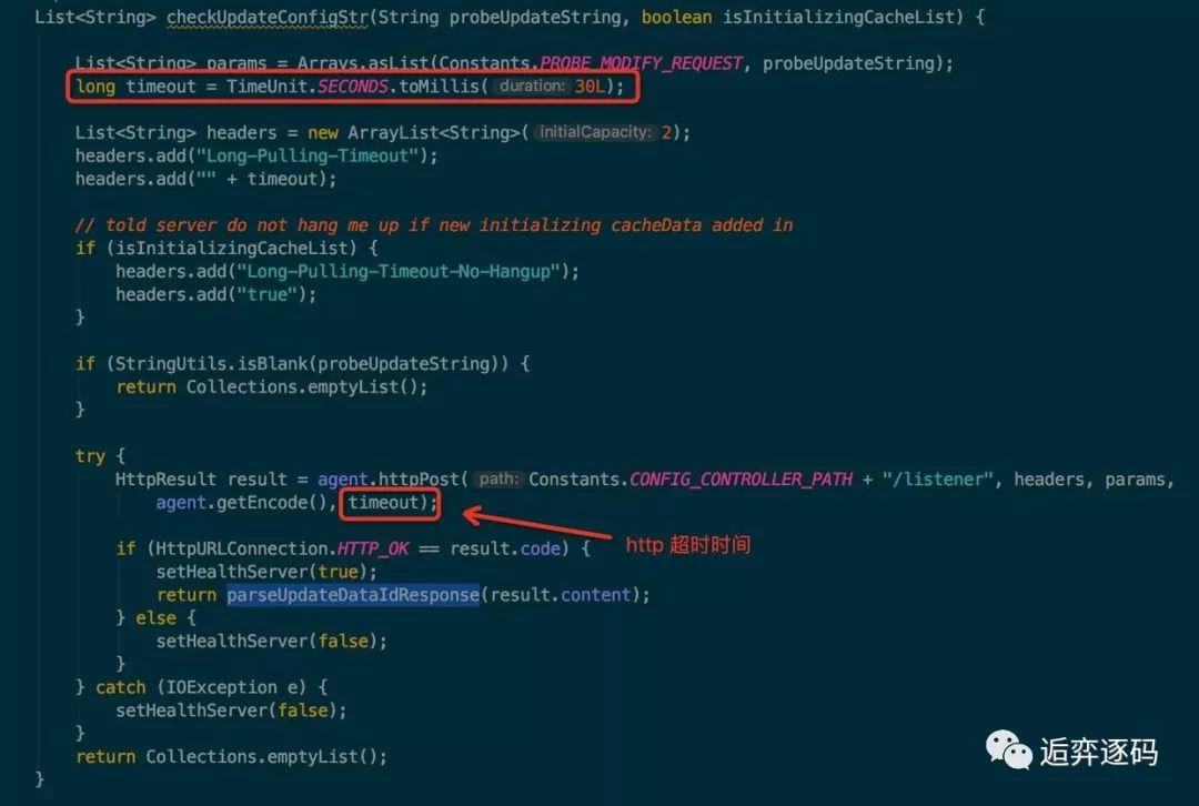 但是请注意我用红框圈出来的代码,服务端拿到客户端提交的超时时间后,又减去了 500ms 也就是说服务端在这里使用了一个比客户端提交的时间少 500ms 的超时时间,也就是 29.5s,看到这个 29.5s 我们应该有点兴奋了。