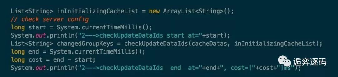 在 LongPollingRunnable 中的 checkUpdateDataIds 方法前后加上时间计算,然后将所消耗的时间打印出来,如下图所示: