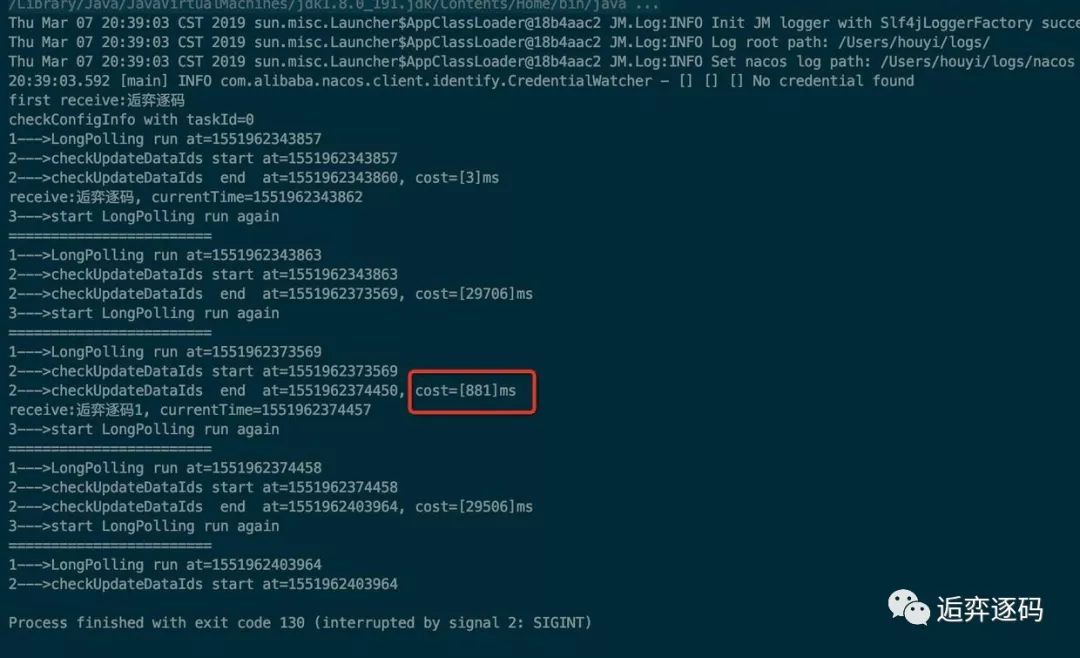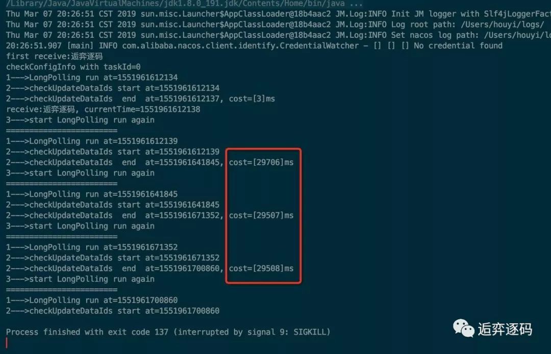 上图中红框中就是我在客户端一发起请求时就更新配置后打印的结果,从结果可以看出来该请求并没有等到 29.5s+ 才返回,而是一个很短的时间就返回了,具体多久需要从服务端的实现中查询答案。