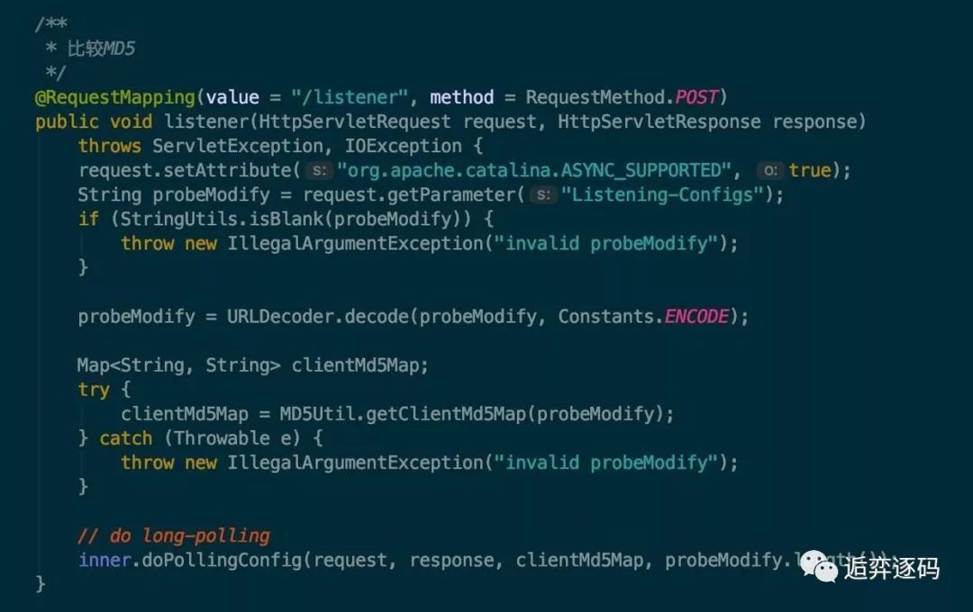 首先我们从客户端发送的 http 请求中可以知道,请求的是服务端的 v1/cs/configs/listener 这个接口。