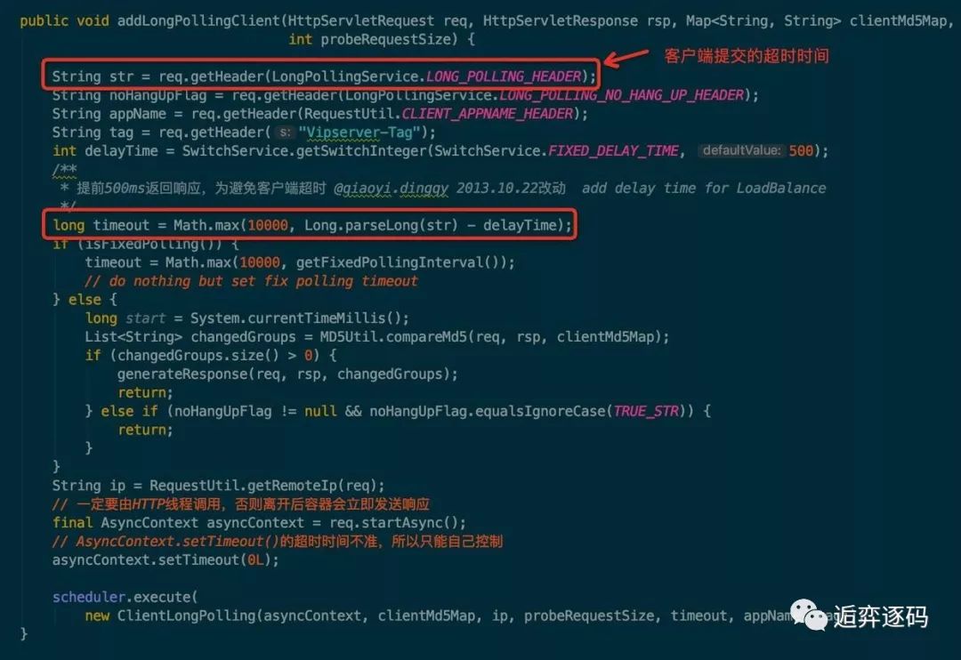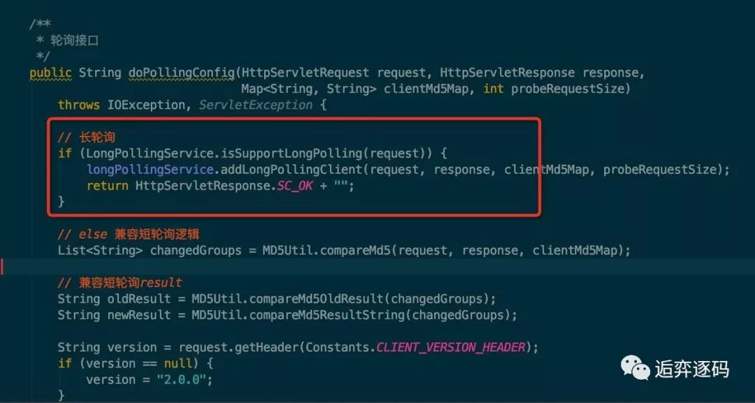 可以看到该方法是一个轮询的接口,除了支持长轮询外还支持短轮询的逻辑,这里我们只关心长轮询的部分,也就是图中红框中的部分。