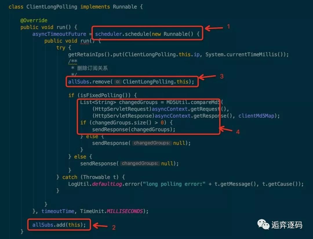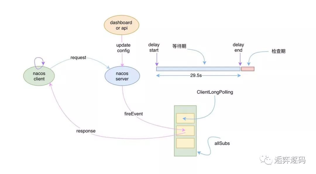 服务端直到调度任务的延时时间到了之前,ClientLongPolling 都不会有其他的任务可做,所以在这段时间内,该 allSubs 队列肯定有事情需要进行处理。