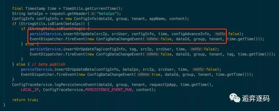 我只截取了重要的部分,从红框中的代码可以看出,修改配置后,服务端首先将配置的值进行了持久化层的更新,然后触发了一个 ConfigDataChangeEvent 的事件。