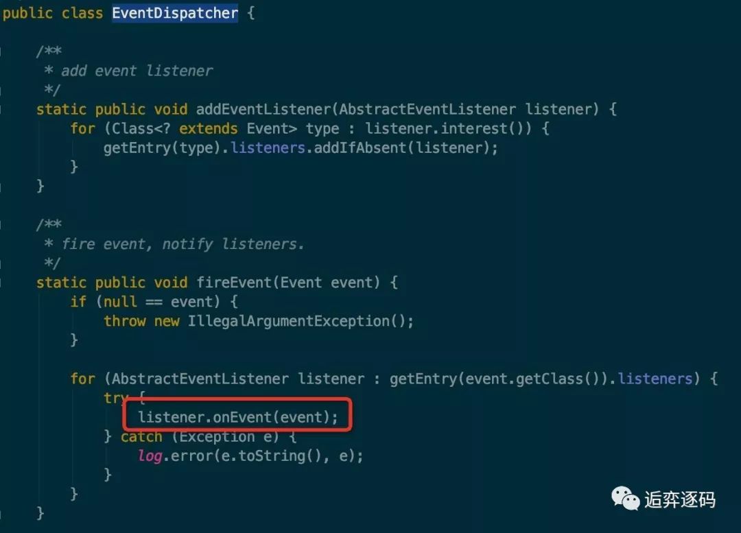fireEvent 方法实际上是触发的 AbstractEventListener 的 onEvent 方法,而所有的 listener 是保存在一个叫 listeners 对象中的。