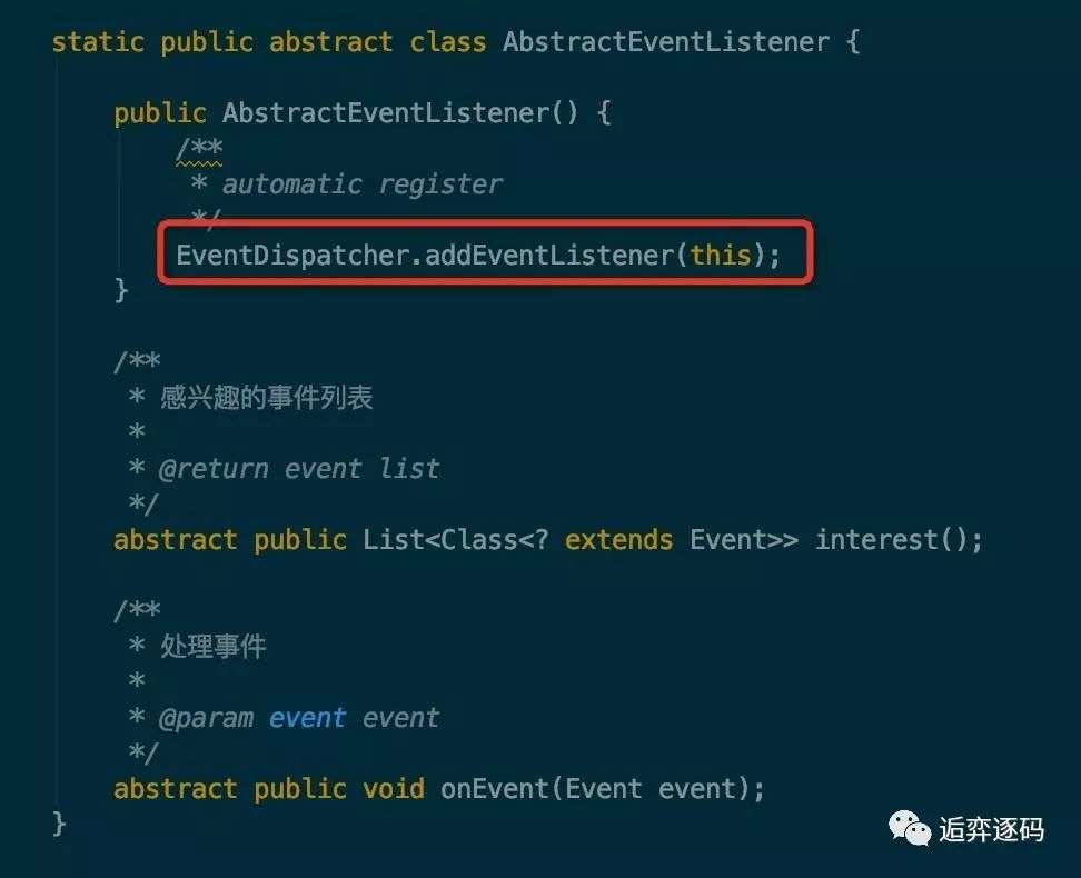 可以找到是在 AbstractEventListener 类的构造方法中,将自身注册进去了,如下图所示: