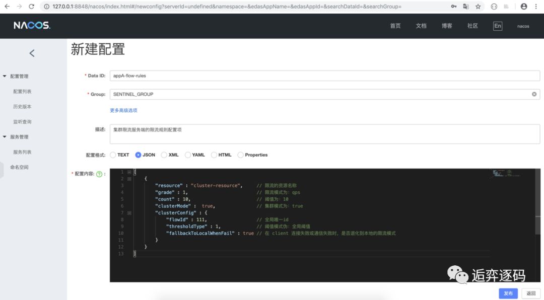 假设我们的 namespace 为 appA,那么我们在 Nacos 中创建服务端的动态规则源如下所示: