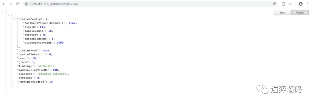 具体的在 Nacos 中创建配置项的步骤,这里就不再继续描述了,服务端的规则如果已经创建过的话,客户端可以直接复用,只需要把 groupId 和 dataId 与服务端的保持一致即可,启动完成后可以通过以下 api 获取系统中的规则: