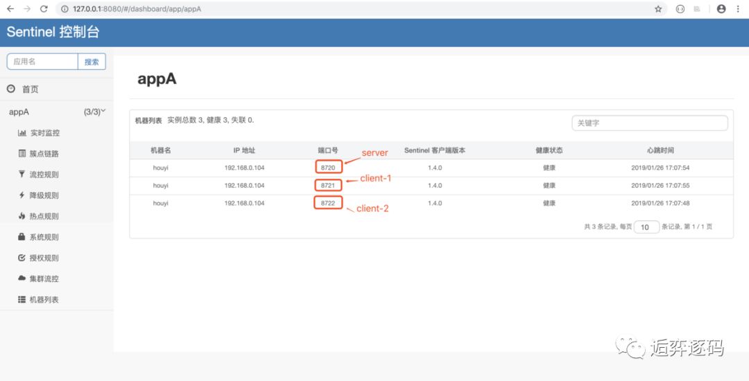 页面上机器的显示方式为 ip@commandPort,其中 commandPort 为应用端暴露给 Sentinel 控制台的端口。