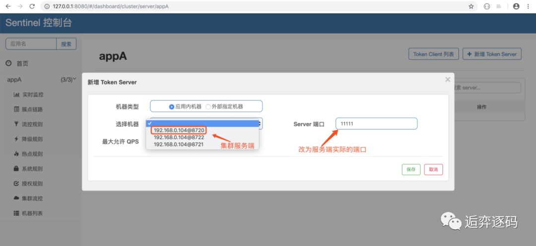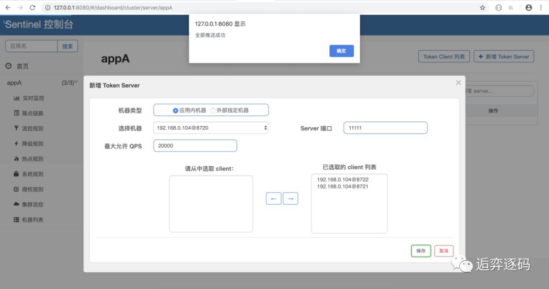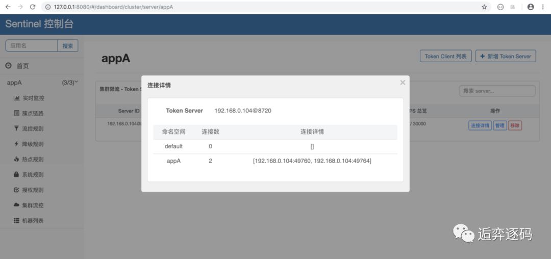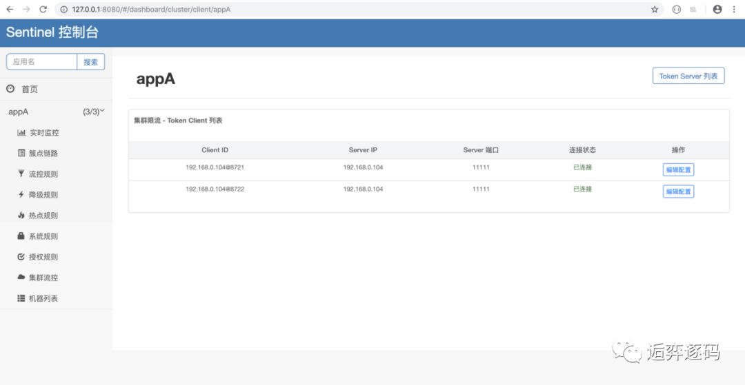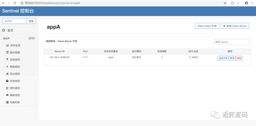 当上面的步骤都完成后,我们就可以在 Sentinel 控制台的【集群流控】页面中的 token server 列表页面管理分配 token server 了。