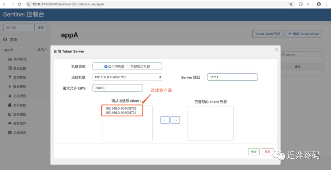 如果在 token server列表中选择 client 时,未出现可选的 client 机器,请先对该 client 发送请求流量以触发 sentinel 的初始化,然后 client 才会连接上 dashboard