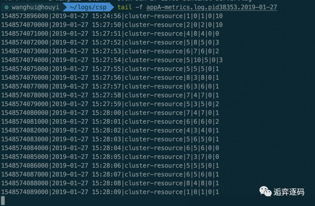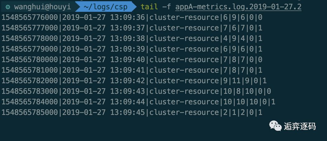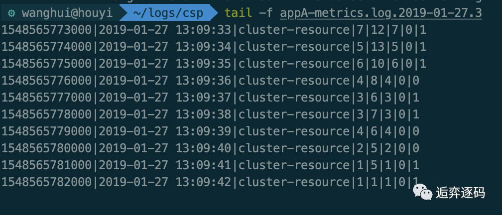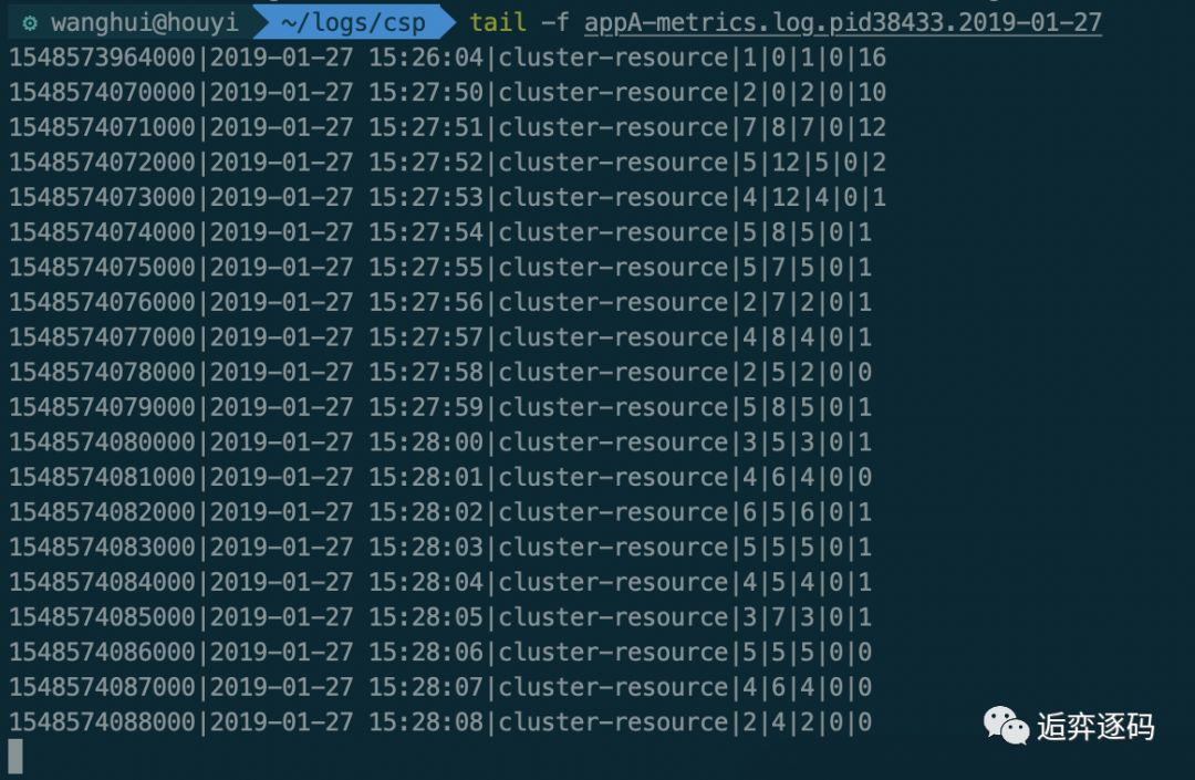 首先我们直接查看 ${appName}-metrics.log 日志文件中打印的信息,在我的机器上有两个 metrics 的log文件,分别对应两个 cluster-client: