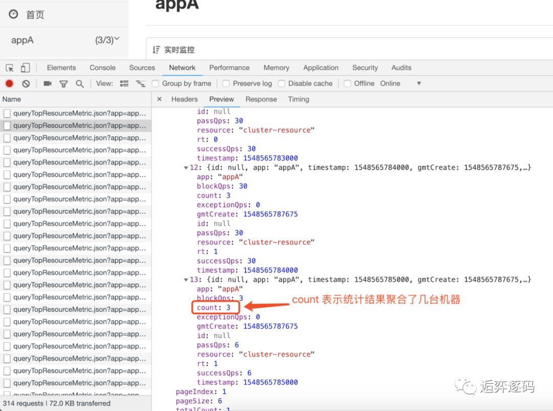 那按照道理 dashboard 中是聚合的两个 client 的 qps 总和,不应该超过10才对,经过与 Sentinel 的开发人员 乐有 的讨论,他怀疑 dashboard 把 token-server 的值也统计进去了,我查看了实时数据返回的结果,如下图所示: