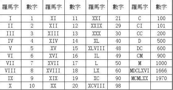 | 罗马数字 | 阿拉伯数字 | 罗马数字 | 阿拉伯数字 |