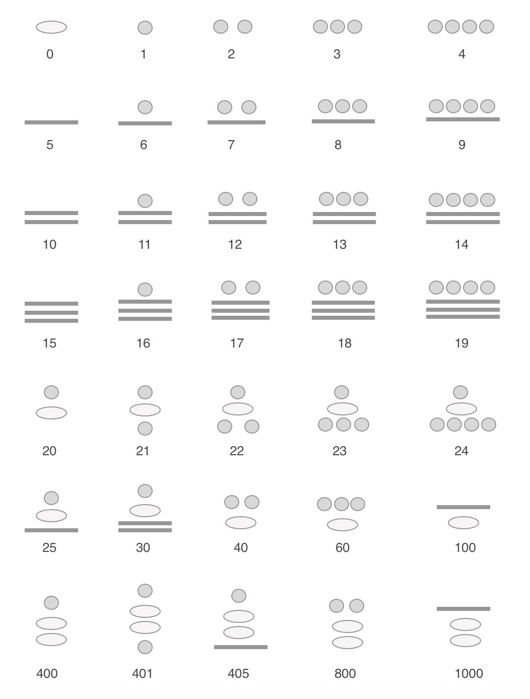 玛雅数字由3个符号的组合构成:0(贝形符号)、1(点)、5(横线)。