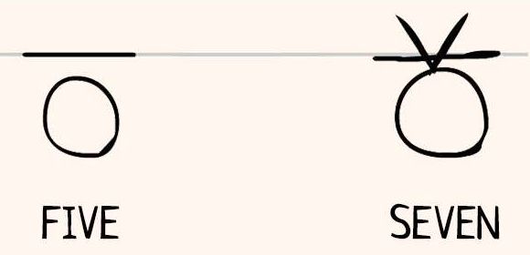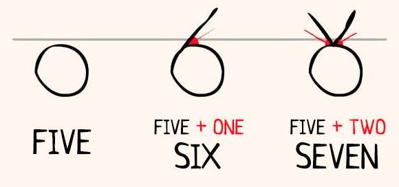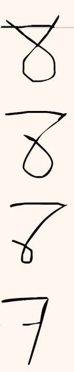 5和7也慢慢的发生了变化,不过那条水平线一直伴随着他们。最终5只取了圆圈的右半部分,用来和6进行区分。