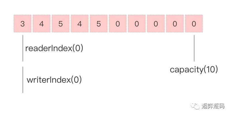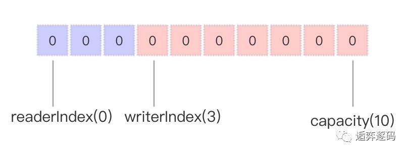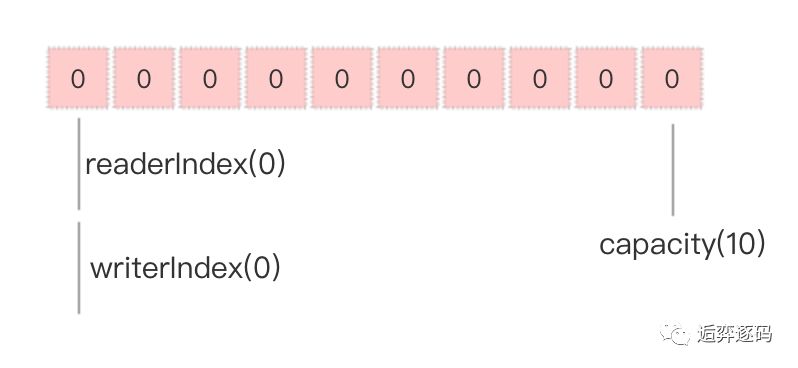 刚初始化的ByteBuf对象,容量为10,读写指针都为0,且每个字节的值都为0,并且这些字节都是“可写”的,我们用红色来表示。