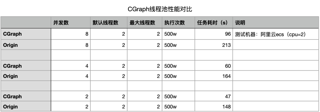 由于常规线程池并不包含自动扩缩容机制,在测试过程中,也是保证 CGraph 中的线程数量 max 和 default 值也设置为相同的。