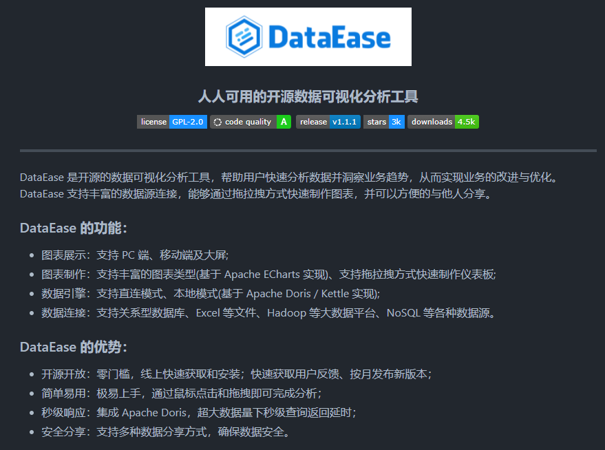 DataEase 是开源的数据可视化分析工具,帮助用户快速分析数据并洞察业务趋势,从而实现业务的改进与优化。DataEase 支持丰富的数据源连接,能够通过拖拉拽方式快速制作图表,并可以方便的与他人分享。