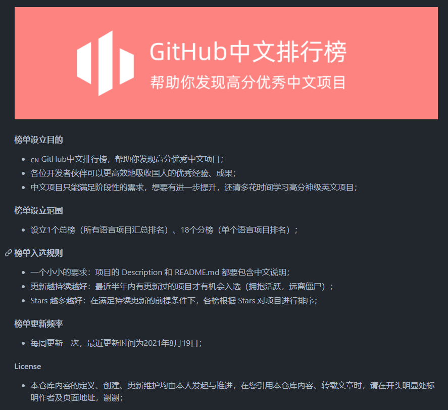 GitHub 中文排行榜,帮助开发者发现高分优秀中文项目、更高效地吸收国人的优秀经验成果;榜单每周更新一次。