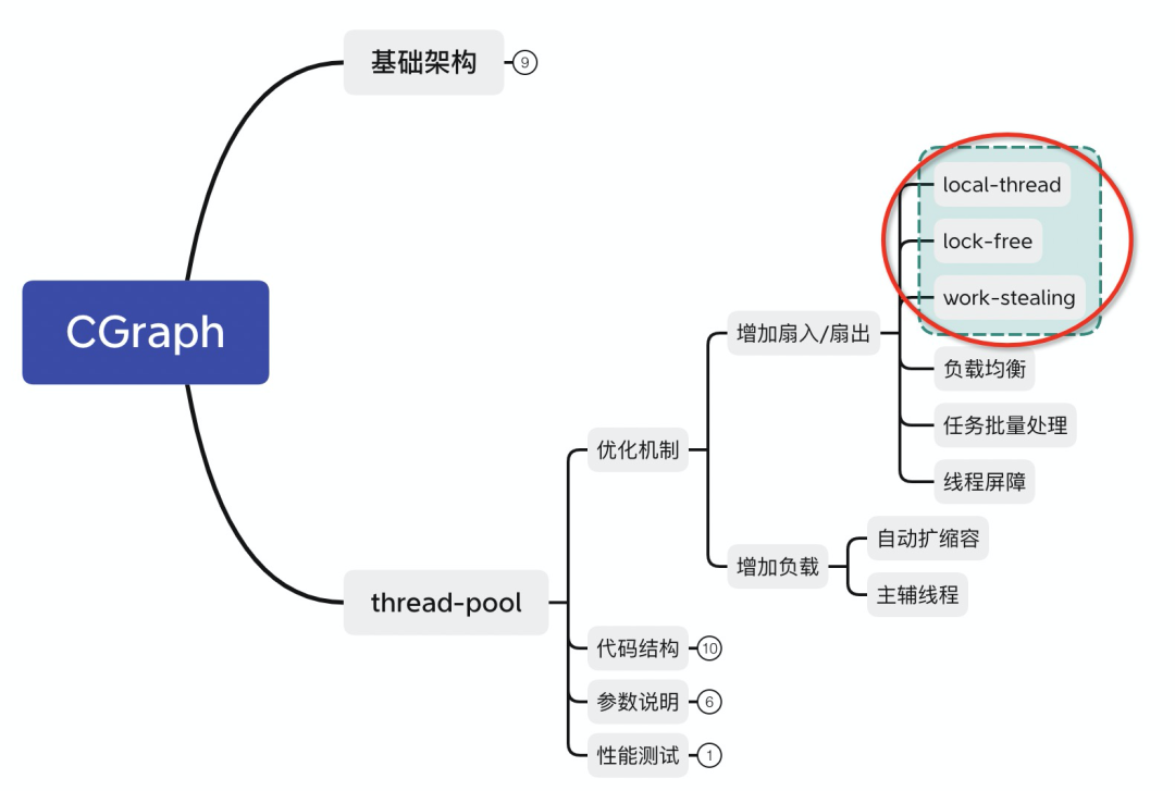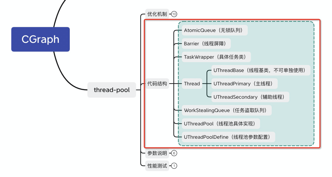 本章主要是介绍了一些线程池在设计过程中,有哪些优化点。总结一下就是下图中画红框的地方,主要的目的就是可以增加扇入扇出。今天分享的这几点偏硬核,都是我在自测过程中,的的确确可以增加调度性能的方案。我们也会在接下来的文章中,继续介绍 CGraph 中线程池的相关优化内容和思路。