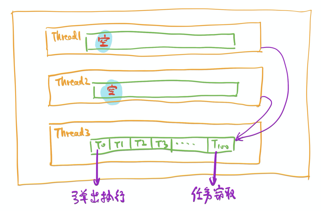 。如果每个 thd 仅执行自己 local queue 中的内容,那这个任务总体的耗时应该是max(100ms, 100ms, 100s) = 100s