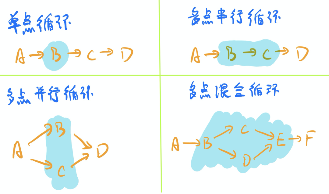 至于多点【混合循环】,可以理解成循环的区域又由好几部分组成,其中的部分区域需要串行,有的部分可以并行。如图第四部分所示,循环处执行的顺序是:b->cd(或 dc)->e。
