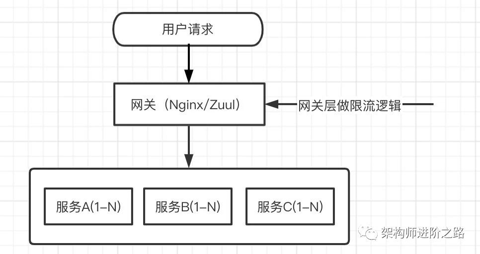 说起服务降级,就不可避免的要聊到限流。我们先考虑一个场景,例如电商平台要搞促销活动,我们按照预估的峰值访问量,准备了 30 台机器。但是活动开始后,实际参加的人数比预估的人数翻了 5 倍,这就远远超出了我们的服务处理能力,给后端服务、缓存、数据库等带来巨大的压力。随着访问请求的不断涌入,最终很可能造成平台系统崩溃。对于这种突发流量,我们可以通过限流来保护后端服务。因为促销活动流量来自于用户,用户的请求会先经过网关层再到后端服务,所以网关层是最合适的限流位置,如下图。