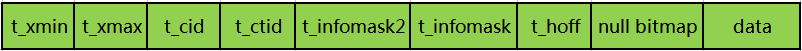 typedef struct HeapTupleFields{TransactionId t_xmin; /* inserting xact ID */TransactionId t_xmax; /* deleting or locking xact ID */union{CommandId t_cid; /* inserting or deleting command ID, or both */TransactionId t_xvac; /* old-style VACUUM FULL xact ID */} t_field3;} HeapTupleFields;struct HeapTupleHeaderData{union{HeapTupleFields t_heap;DatumTupleFields t_datum;} t_choice;ItemPointerData t_ctid; /* current TID of this or newer tuple (or a* speculative insertion token) *//* Fields below here must match MinimalTupleData! */#define FIELDNO_HEAPTUPLEHEADERDATA_INFOMASK2 2uint16 t_infomask2; /* number of attributes + various flags */#define FIELDNO_HEAPTUPLEHEADERDATA_INFOMASK 3uint16 t_infomask; /* various flag bits, see below */#define FIELDNO_HEAPTUPLEHEADERDATA_HOFF 4uint8 t_hoff; /* sizeof header incl. bitmap, padding *//* ^ - 23 bytes - ^ */#define FIELDNO_HEAPTUPLEHEADERDATA_BITS 5bits8 t_bits[FLEXIBLE_ARRAY_MEMBER]; /* bitmap of NULLs *//* MORE DATA FOLLOWS AT END OF STRUCT */};