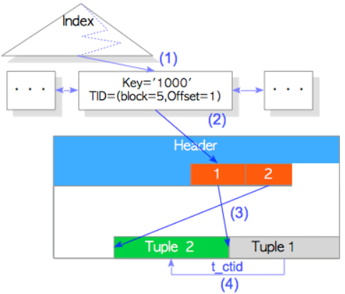 key=1000,根据key值在索引中找到tid为5号页面的1号元组,再通过一号元组行指针找到元组1,检查元组1的t_ctid字段,发现指向了新的元组2,于是定位到真实元组数据2。