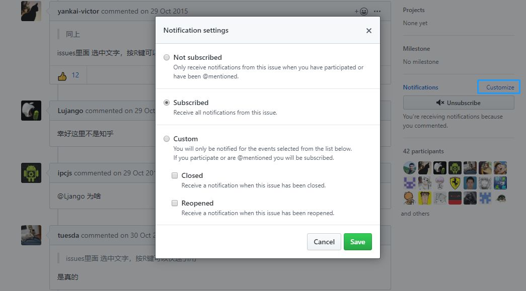 意味着取消对本项目的关注,你将不会收到与你无关的通知,而与你有关的,即上文提到的 Participating
