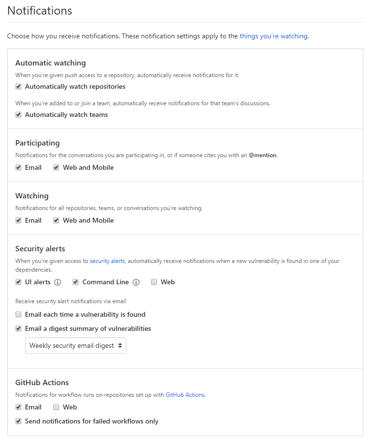 在 GitHub Notifications[2] 设置页面,我们还可以选择接收消息通知的方式。这些设置适用于我们正在关注的内容。
