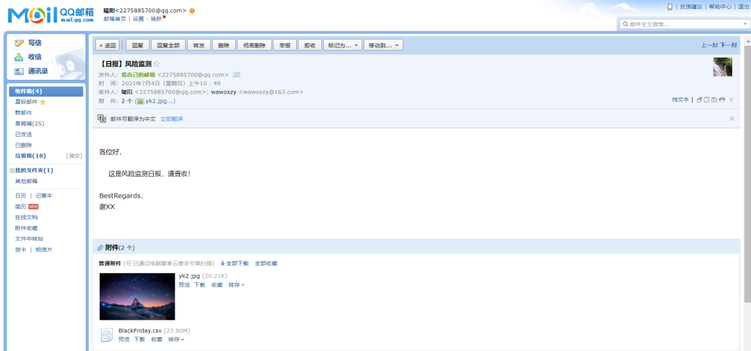 mail_sender = "2275885700@qq.com" # 发送者邮箱名mail_license = '****************' # 发送者邮箱授权码,即开启POP3/SMTP服务获取的token,需替换成你的邮箱mail_host = "smtp.qq.com" # SMTP服务器,这里为qq邮箱,若为163邮箱请用163替换qqmail_receivers = ["2275885700@qq.com","wawoxzy@163.com"] #收件人邮箱mail = MIMEMultipart('related') # 设置邮件主体mail["From"] = "sender_name<2275885700@qq.com>" # 设置发送者邮箱mail["To"] = "receiver_1_name<2275885700@qq.com>,receiver_2_name<wawoxzy@163.com>" #设置接受者邮箱subject_content = '【日报】风险监测' # 设置邮件主题mail["Subject"] = Header(subject_content,'utf-8') # 添加邮件主题body_content = """各位好,这是风险监测日报,请查收!BestRegards,谢XX""" # 设置邮件正文message_text = MIMEText(body_content,"plain","utf-8") # 设置正文内容、文本格式、编码方式mail.attach(message_text) # 向MIMEMultipart对象中添加文本对象