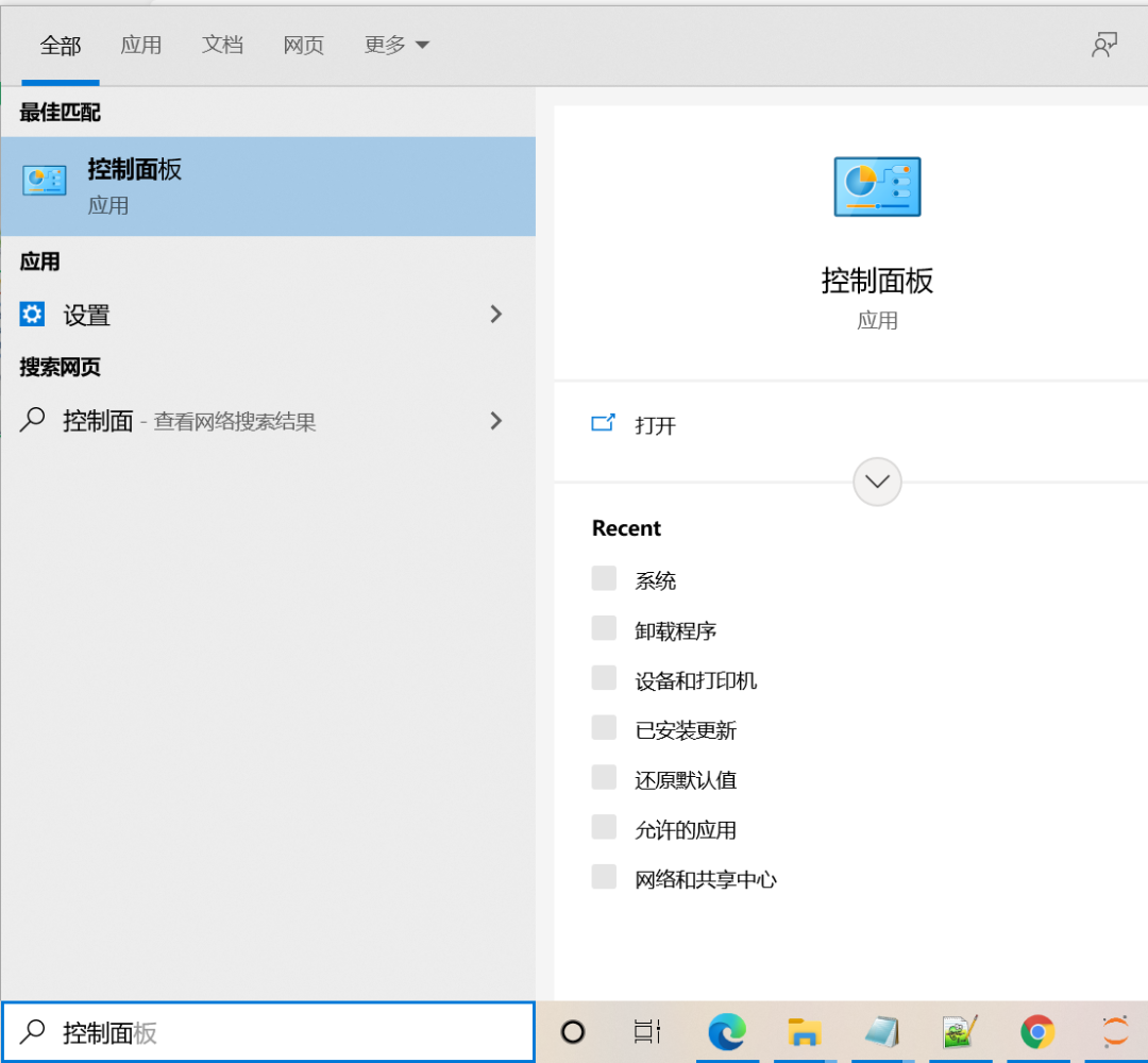 首先,点击windows桌面左下角的搜索菜单,输入“控制面板”,就会在最佳匹配中出现控制面板,点击控制面板。