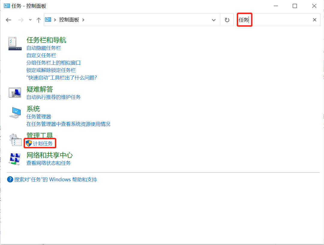 接着,在控制面板的搜索框输入”任务“两个字,就会出现管理工具和计划任务,点击计划任务。