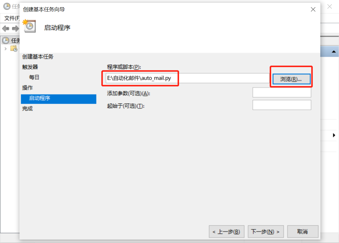 接着点击浏览,选择需要定时是python脚本,最后点击完成即可。